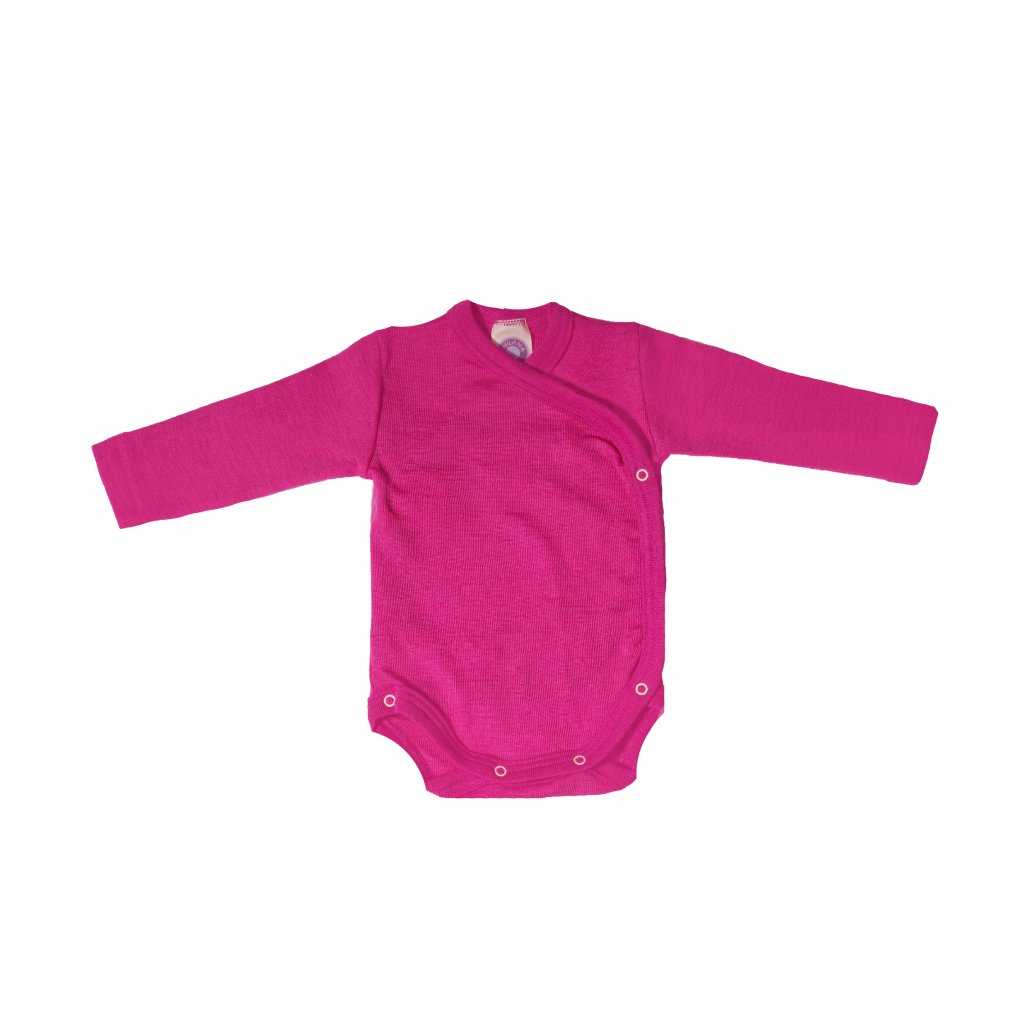 Body dziecięce kopertowe z wełny merino i jedwabiu Cosilana z długim rękawem różowe