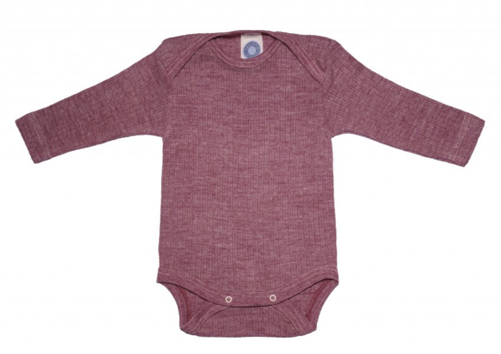 Body dziecięce z wełny merino, bawełny i jedwabiu Cosilana z długim rękawem, kolor bordowy melanż