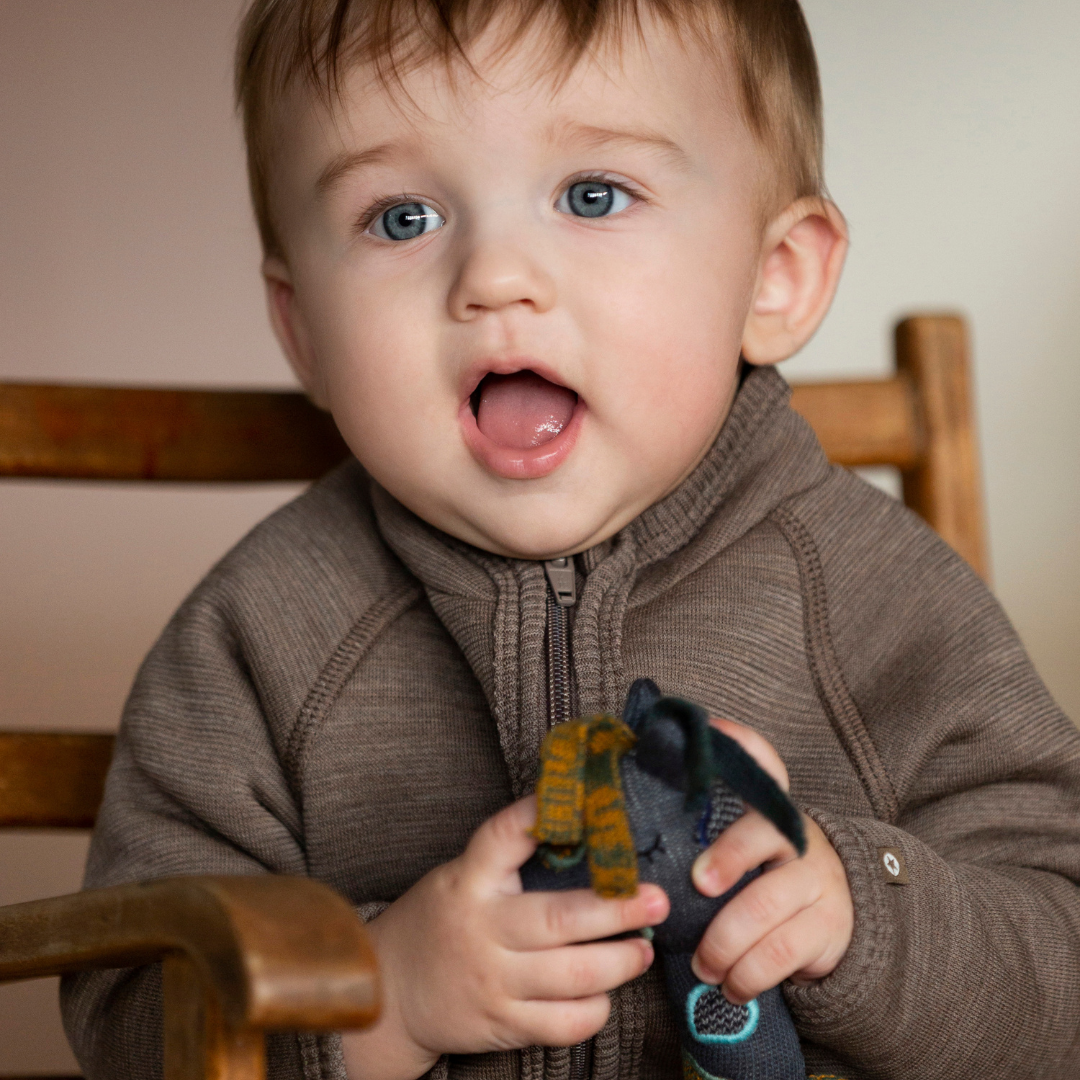 Wełna merino to jeden z najinteligentniejszych naturalnych materiałów, który idealnie dopasowuje się do potrzeb dziecięcego ciała. Pomaga utrzymać stałą temperaturę ciała, dzięki czemu niemowlęciu nie jest ani zimno, ani zbyt ciepło. Wełna oddycha, odprowadza wilgoć od skóry i ma naturalne właściwości antybakteryjne – dzięki temu jest idealna również dla wrażliwej lub alergicznej skóry.