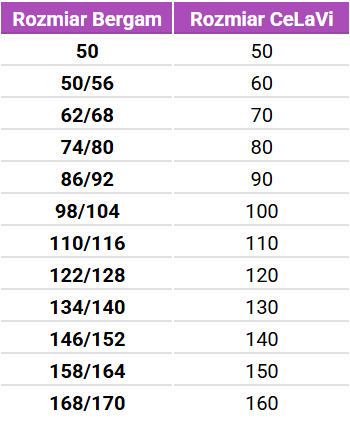 Rozmiary producenta CeLaVi są nieco większe, dlatego prosimy o zwrócenie uwagi na wybór.