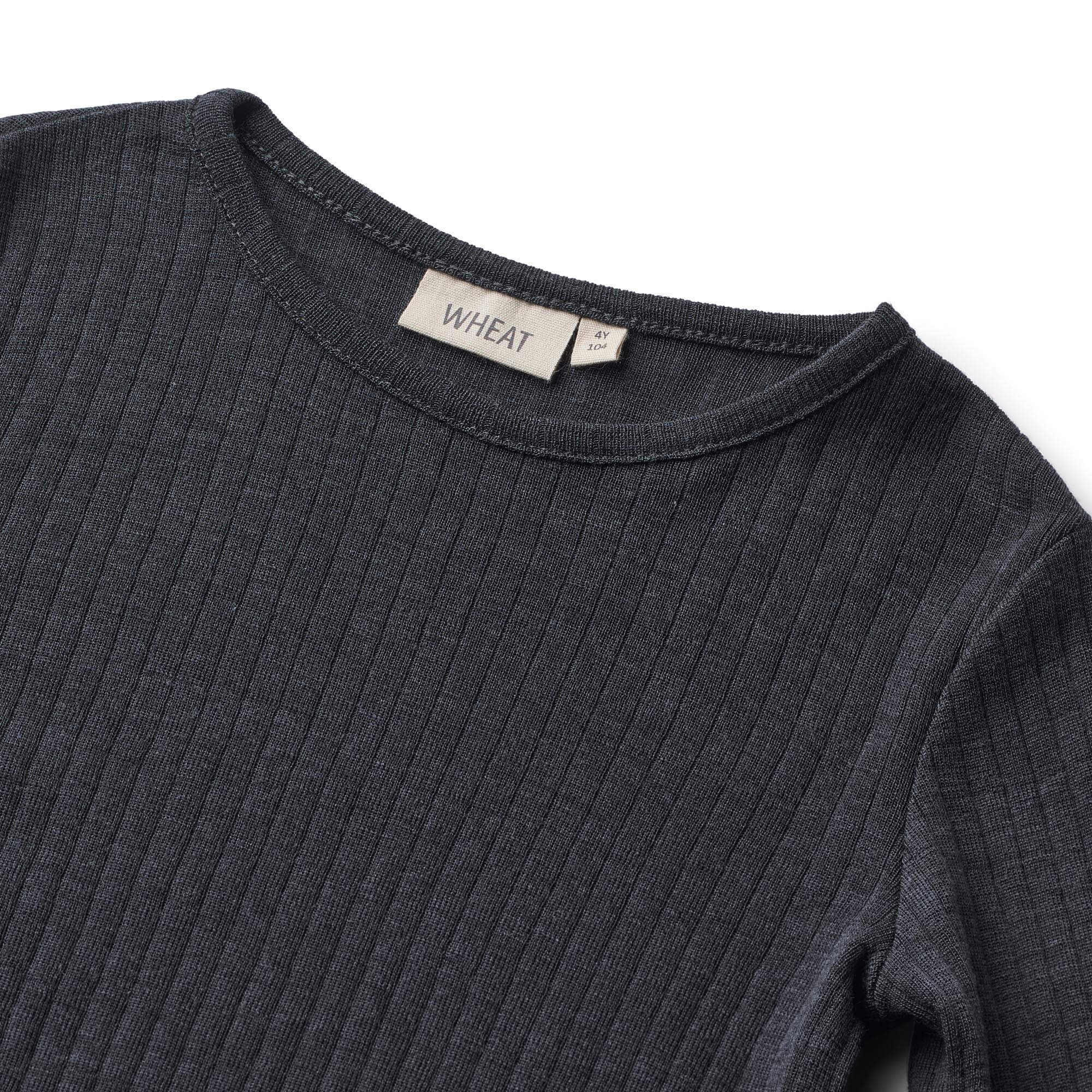 Dziecięca koszulka z długim rękawem z wełny merino i jedwabiu, niebieska navy Wheat