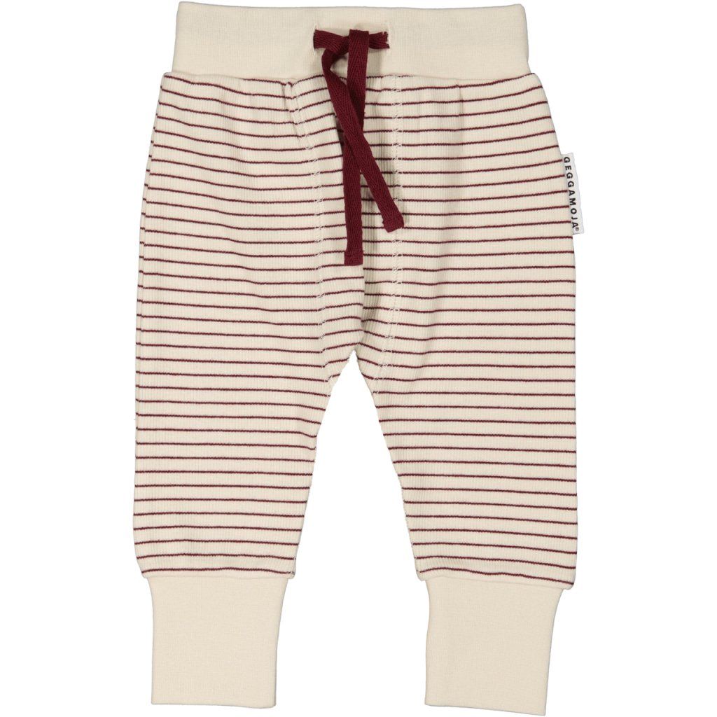 Dziecięce spodnie typu haremki bawełna organiczna GOTS Burgundy stripe Geggamoja