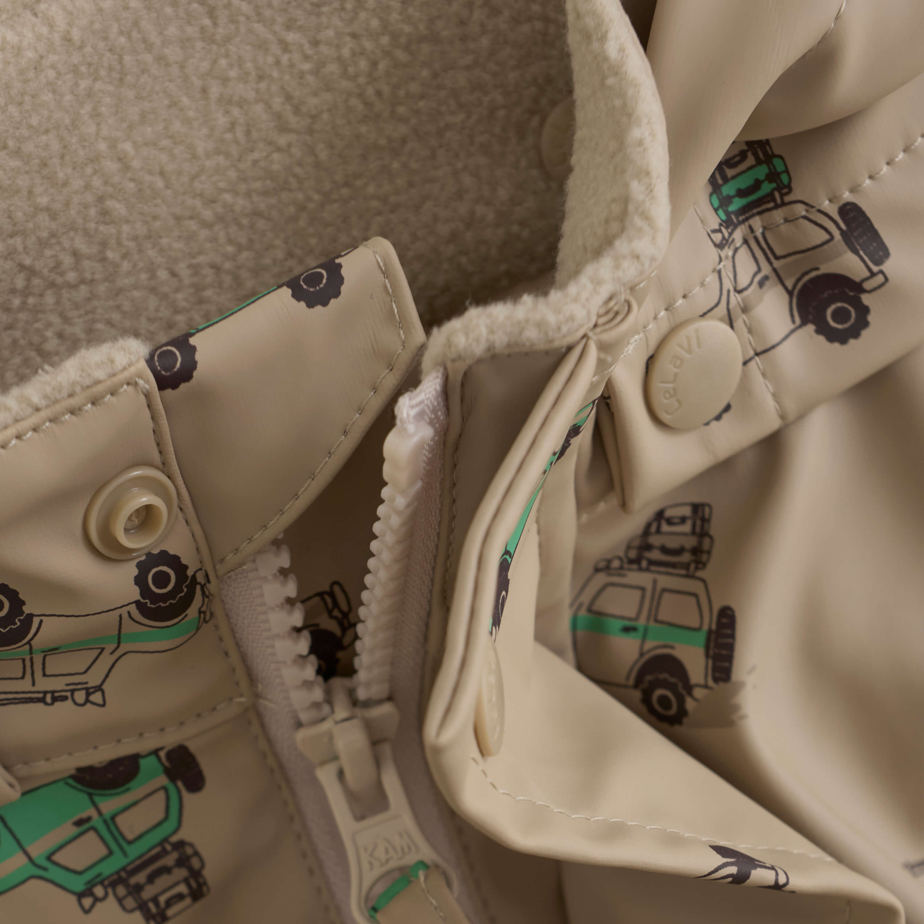Dziecięcy kombinezon przeciwdeszczowy White Pepper z motywem samochodów CeLaVi