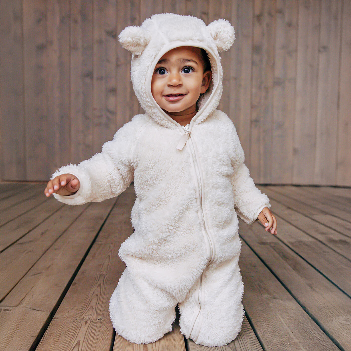 Kombinezon ma praktyczny zamek błyskawiczny na całej długości poprowadzony skośnie, co ułatwia ubieranie i rozbieranie nawet najmłodszych. Kaptur z uroczymi uszkami chroni główkę przed chłodem i dodaje stylizacji zabawnego wyglądu, który zachwyci każdego rodzica. Dzięki elastycznym mankietom rękawy i nogawki pozostają na swoim miejscu i chronią przed przewiewaniem.