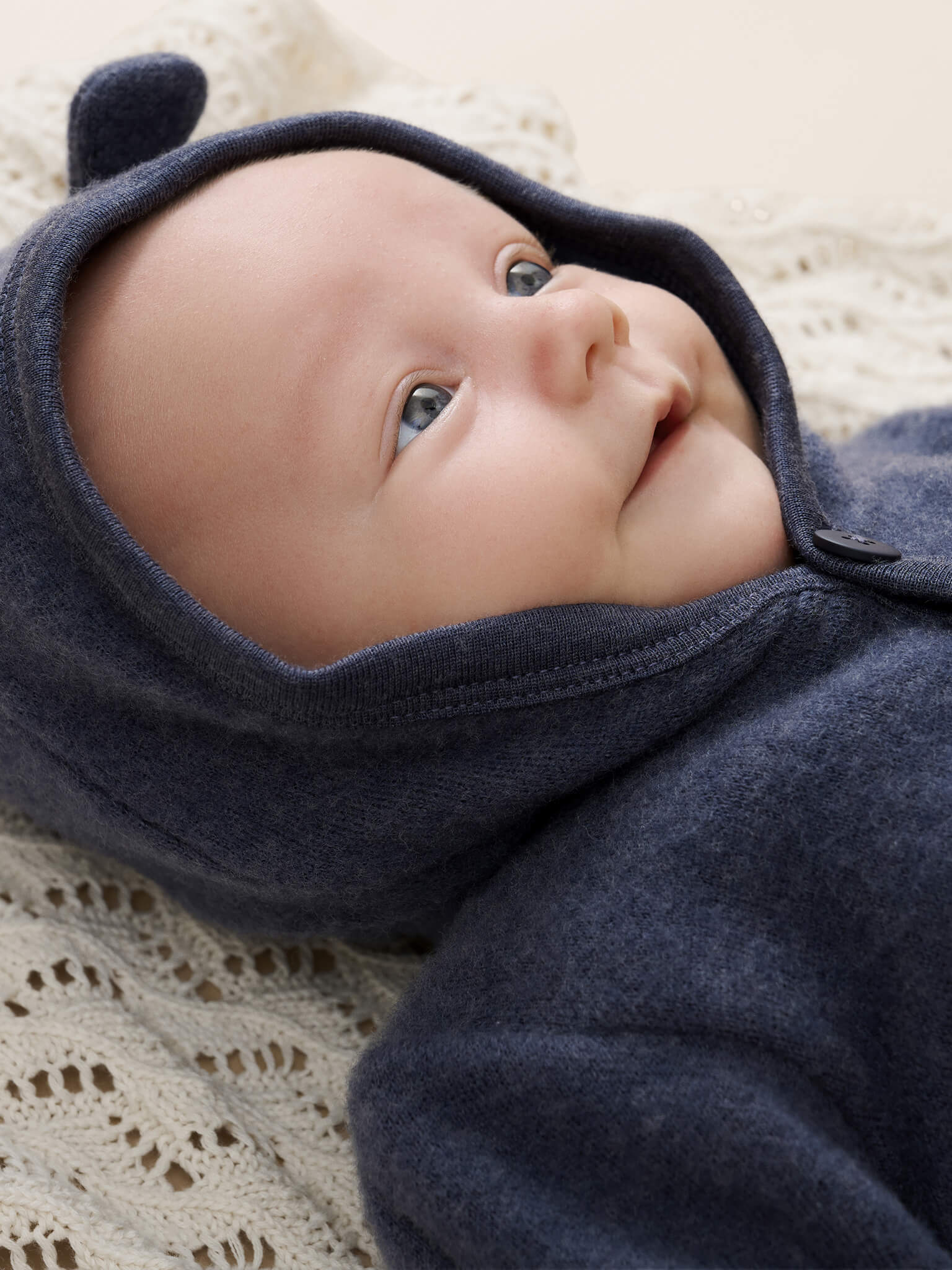 Merino kombinezon całoroczny z kapturem z uszkami zapinany na guziki niebieski Infinity Fixoni