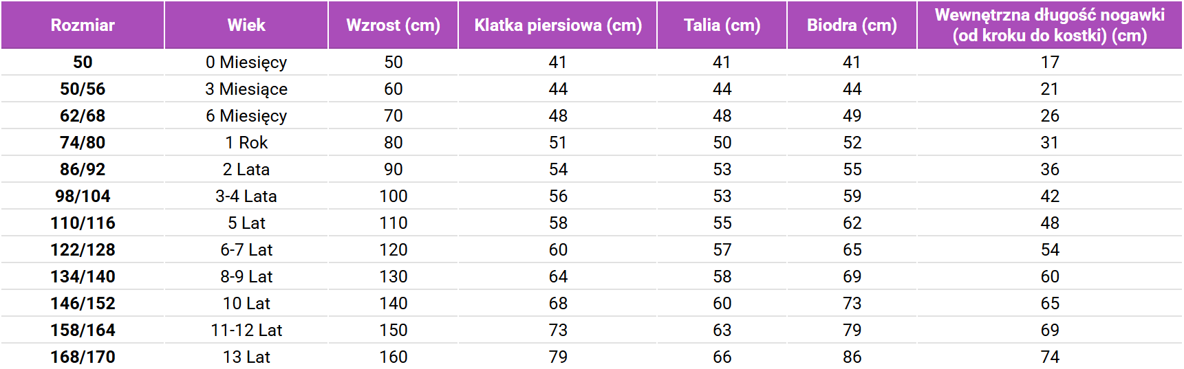Tabela rozmiarów CeLaVi Kombinezony zimowe