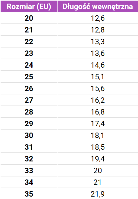 Tabela rozmiarów En Fant Kalosze ocieplane