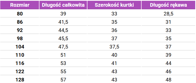 Tabela rozmiarów kurtek zimowych Mikk-Line z futerkiem