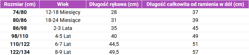 Tabela rozmiarów LFOH Koszulka z długim rękawem