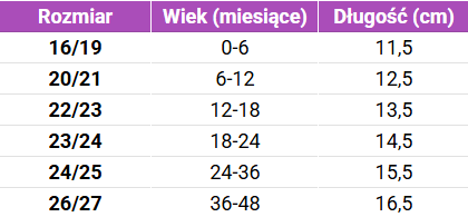 Tabela rozmiarów Mikk-line Buciki niemowlęce