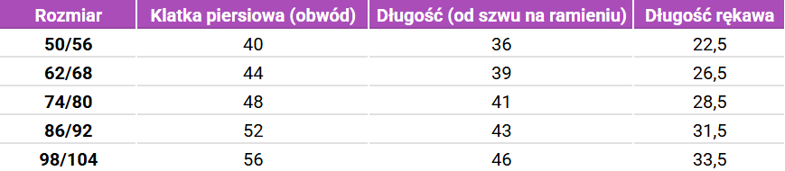 Tabela rozmiarów SAFA Body