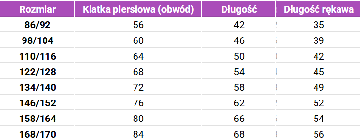 Tabela rozmiarów SAFA Koszulki dziecięce