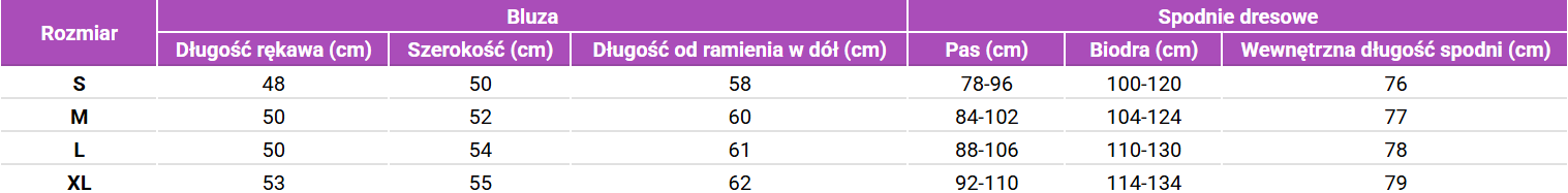 Tabela rozmiarów SAFA PEGASUS Zestaw damski